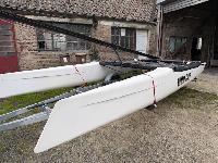 Très bon état d'origine - Toujours hiverné à l'abri Dérives carbone, voiles blanche, foc autovireur et spi rouge avec avaleur Remorque de route PAM grosses roues avec roue jockey et support de mat télescopique Prix : 3.950 € A SAISIR